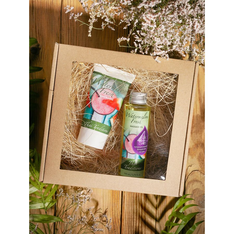 В ассортименте Thai Traditions представлено много вариантов наборов косметики: и подарочный набор косметики для тела Арбузный Фреш, и косметический подарочный набор Авокадо, и бьюти-бокс с косметикой Инжир и другие. Натуральная косметика для тела подарит счастливому получателю увлажнение и питание кожи, повышение эластичности кожи, устранит сухость и шелушение, поможет сохранить молодость и красоту кожи. В набор входит: массажное масло 110 мл, мусс для рук, коробока